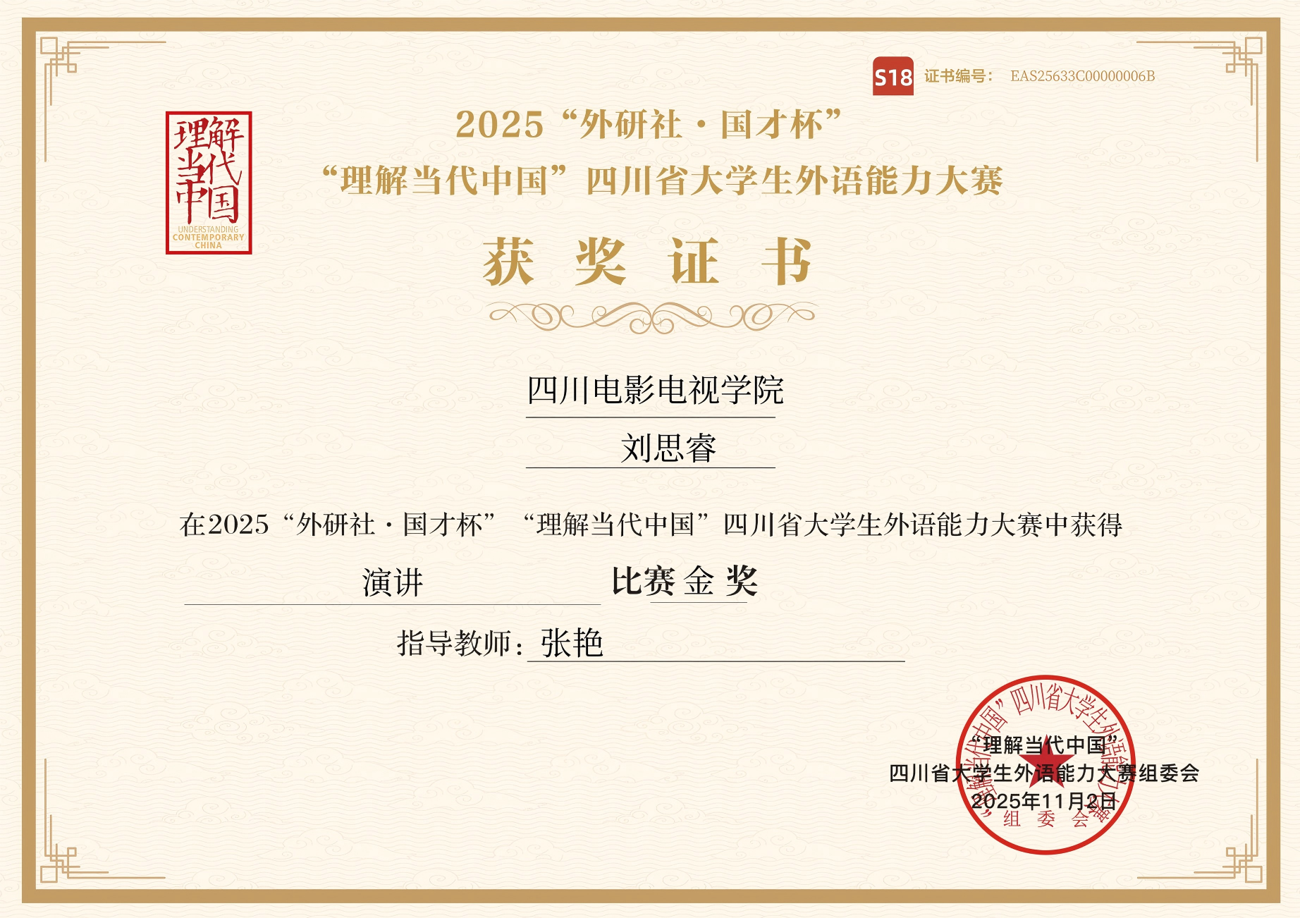 刘思睿同学在2025“外研社·国才杯”“理解当代中国”四川省大学生外语能力大赛中斩获金奖