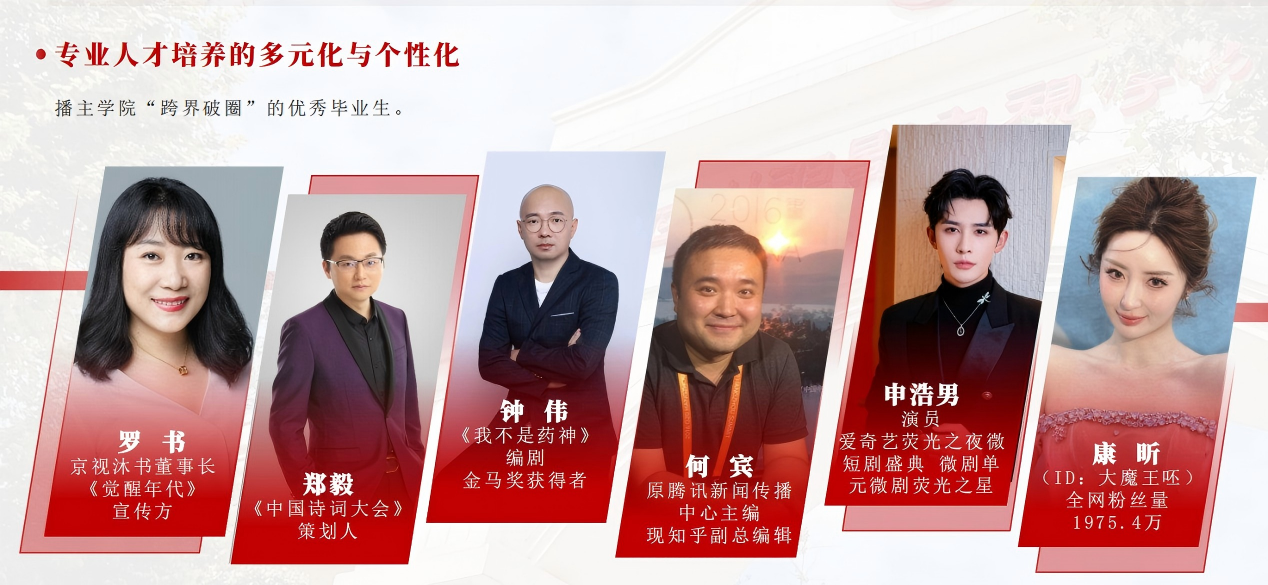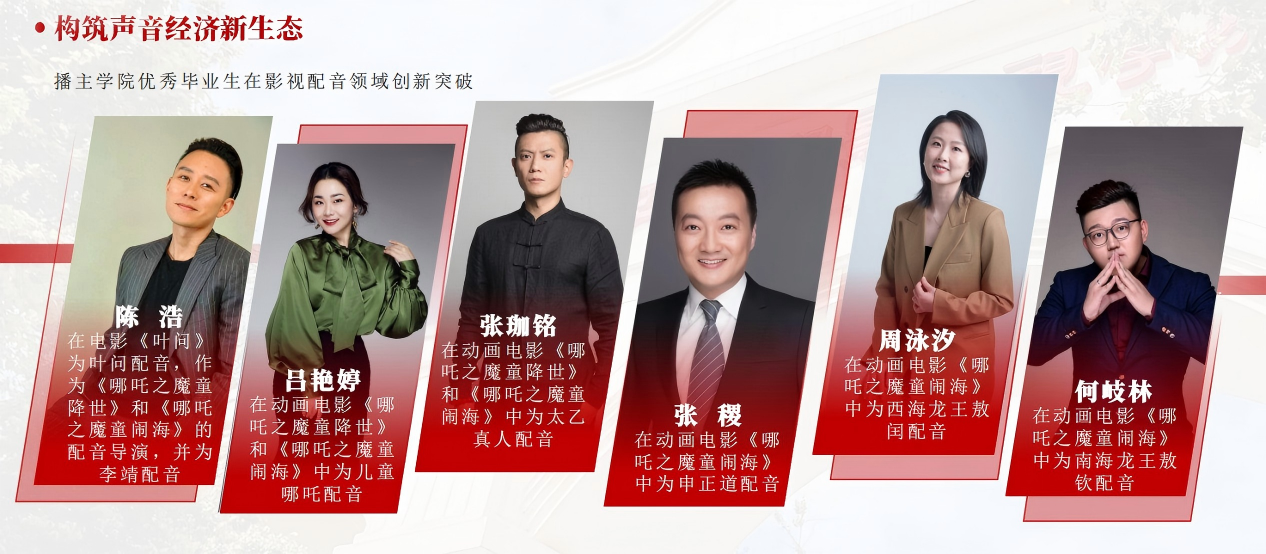 还有不少毕业生“跨界破圈”,在影视创作、互联网传播、声音经济等领域闯出一片天地,其中吕艳婷、张珈明等成为知名配音演员,参与《哪吒之魔童降世》等爆款作品创作。
