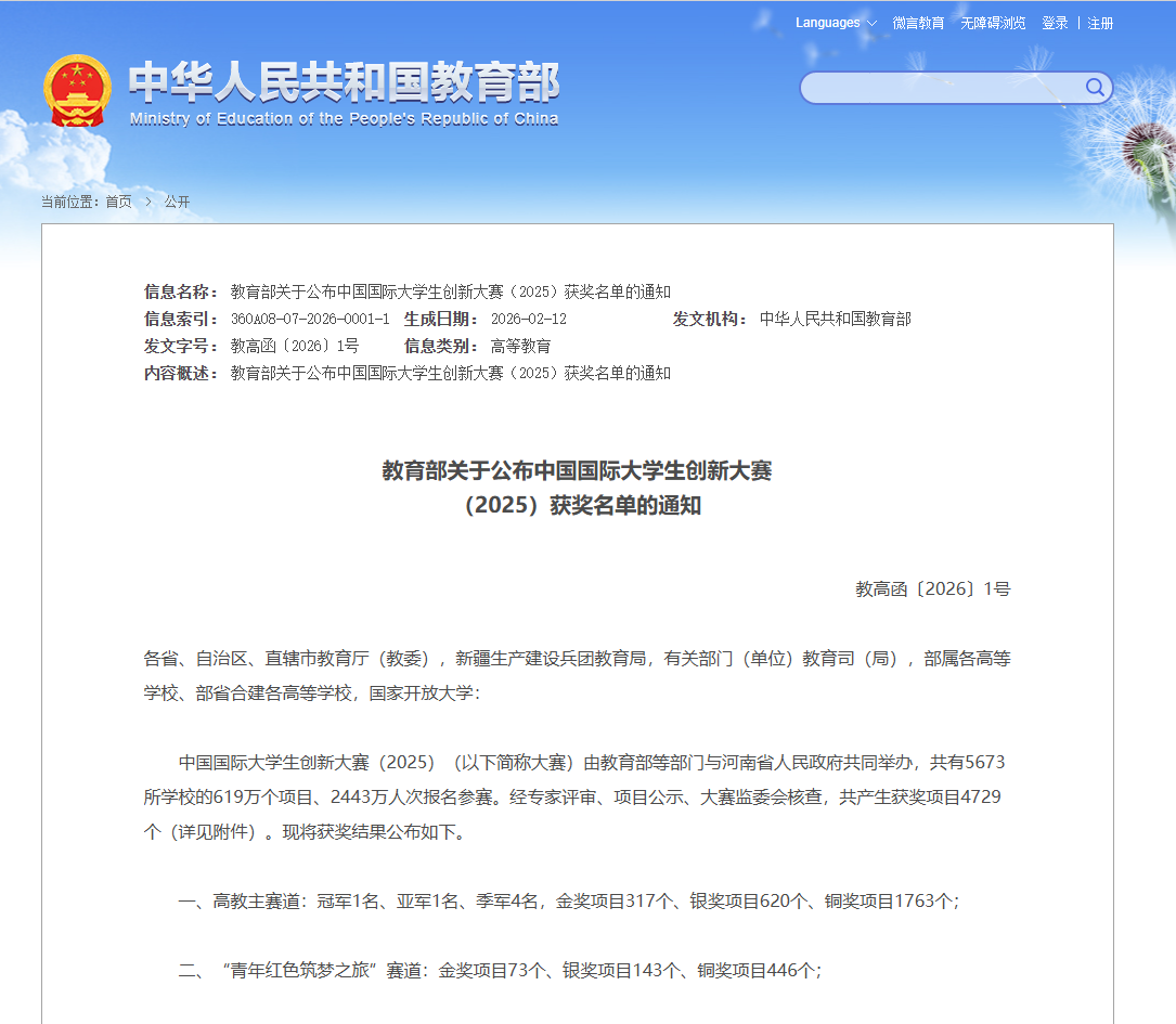 详情请看链接:http://www.moe.gov.cn/srcsite/A08/s7056/202602/t20260227_1429516.html