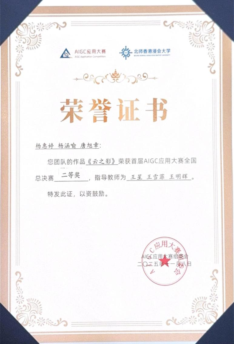 播音主持学院记编提高班同学杨惠婷、杨涵喻、唐旭章创作的《云之影》荣获首届AIGC应用大赛全国总决赛二等奖;学院教师王星、王雪菲、王明辉获优秀指导教师奖。