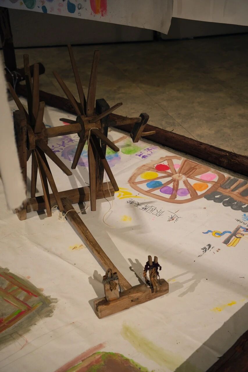 《田器谜》聚焦于改革开放前的农耕记忆。四川传统农具的意象被不同年代的记忆和认知重新定义,通过社区工作坊,时代的变迁在孩子们的笔下,用图形和颜色描绘。在他们的绘制与改造中,工具转化为符号化的图像,重构出介于记忆与幻想之间的形态。最终,这些“再造的农具”汇聚为一件光影装置,超越了物件本身,成为代际对话的媒介--在童真的创造力与集体记忆的交汇处,农耕文化获得新的可见性。
