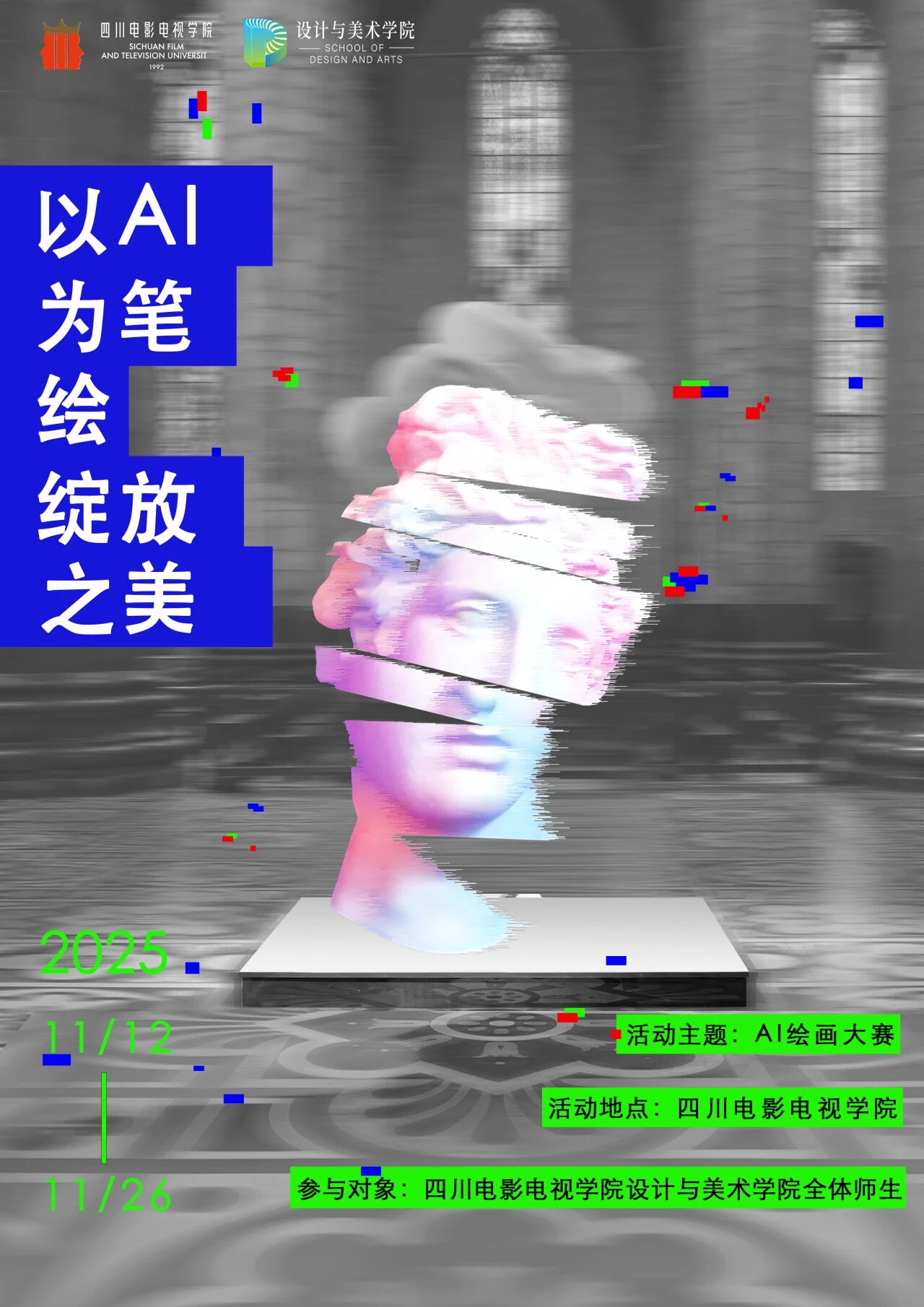 当灵感碰撞科技,一场关于美学与技术的盛宴即将在11月绽放。为丰富校园文化生活,挖掘学生创作潜力,四川电影电视学院设计与美术学院经过细致筹备,于2025年11月特举办AI绘画大赛,面向全院在校生开启一场融合艺术与技术的创作之旅。