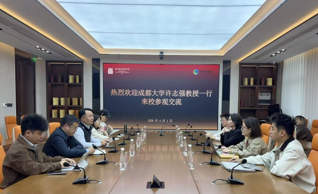 2026年4月1日下午,成都大学影视与动画学院副院长许志强、数字媒体系副主任陈佳娉、教师伏东海、陶炳塬,以及实验教学中心赵然博士一行莅临四川电影电视学院新媒体学院交流座谈。我院执行院长段晓冉、副院长毕园,以及数字媒体艺术专业教师胡余、王虹垒参与座谈。