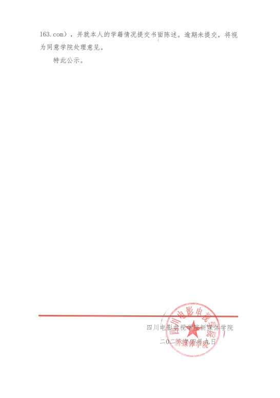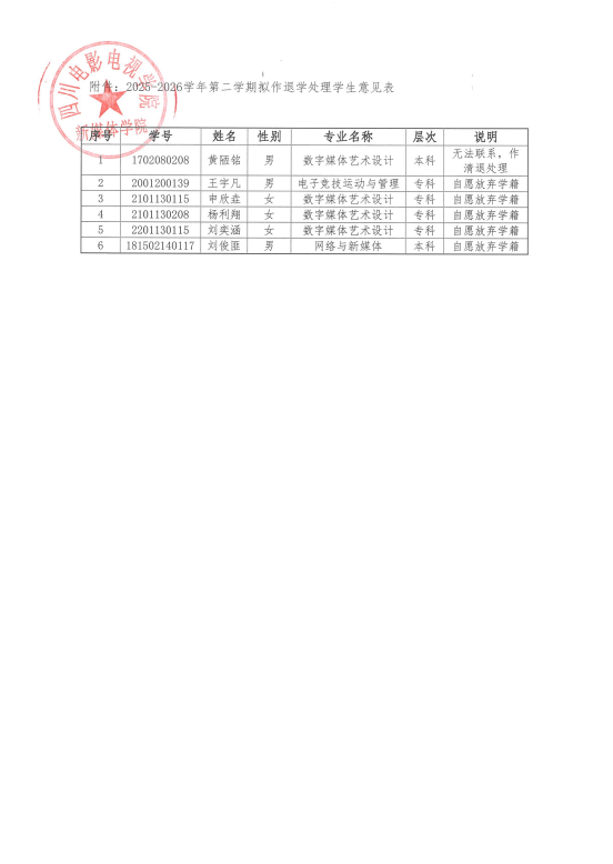 四川电影电视学院新媒体学院关于拟对黄陋铭等6名无法联系或自愿放弃学籍学生作自动退学处理的公示