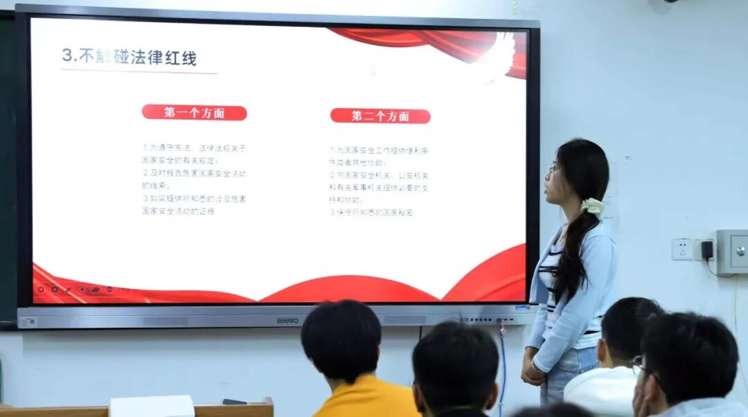 班会伊始,向同学们详细解读了《中华人民共和国国家安全法》的相关内容,明确2015年7月1日全国人大常委会通过该法律,并将每年4月15日定为全民国家安全教育日的重要意义。宣讲强调,设立全民国家安全教育日,旨在推动国家安全宣传教育深入校园、走进生活,帮助每一位大学生认清“国家安全并非遥远概念”,其与日常网络使用、信息保护、行为规范紧密相关,贯穿学习生活的每一处细节。