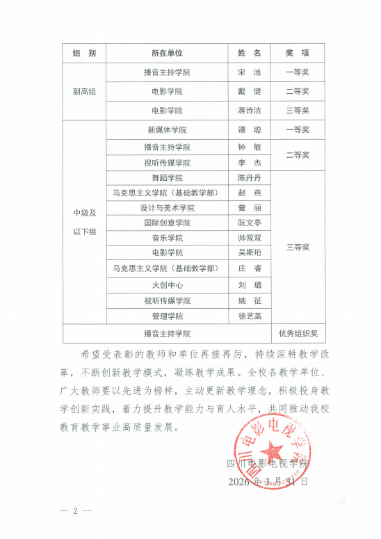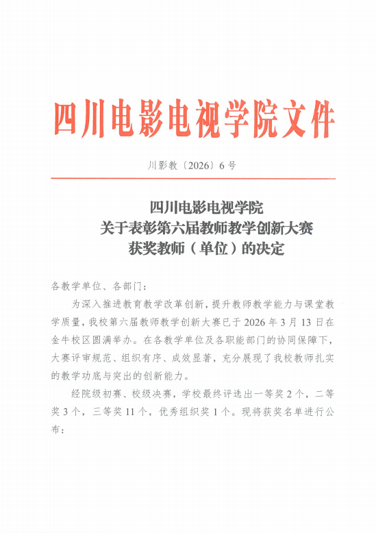 在本次大赛中,学院谭聪老师积极备赛、勇于创新,凭借先进的教学理念、科学的教学设计与良好的课堂效果,荣获四川电影电视学院第六届教师教学创新大赛中级及以下组一等奖。
