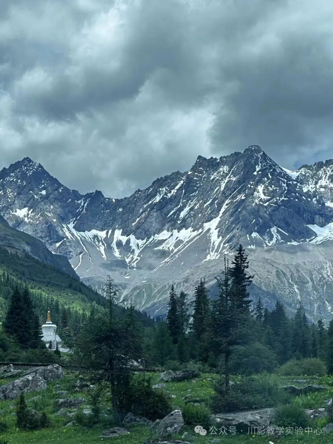 阳光穿过森林映下斑驳,风中的树叶摇曳生姿,小溪沿着石滩缓缓流淌,抬头便是巍峨的雪山。