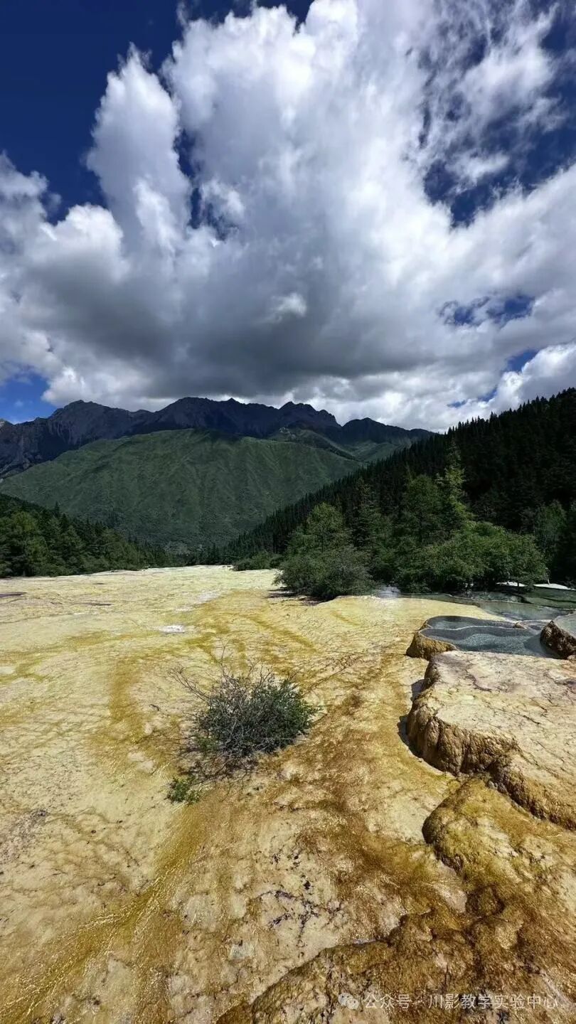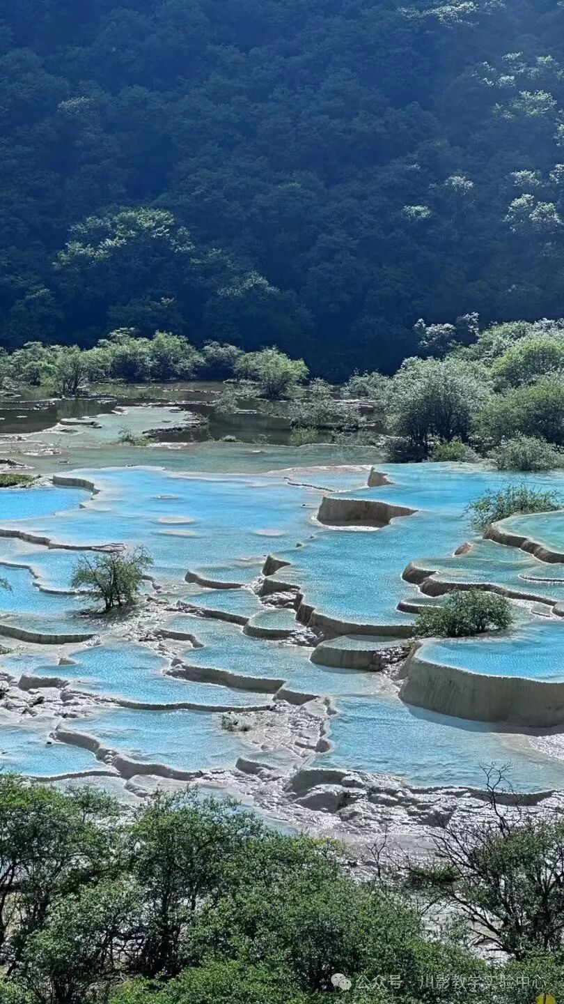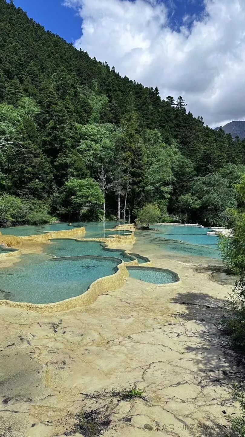 “人间瑶池,五彩梯田”,湖底的石灰华形成了形状各异的盆地,在阳光的照射下,这些石灰华会呈现出五彩斑斓的色彩,仿佛让人来到了童话世界。