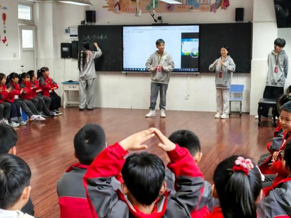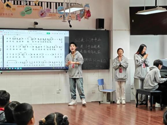 课堂上,大家一同学唱励志歌曲《左手右手》,用纯净歌声传递温暖、勇气与力量,在轻松愉悦的氛围中引导孩子们积极面对成长、学会团结互助。志愿者们以耐心陪伴、温柔引导拉近与孩子们的距离,用艺术之美滋养童心、浸润心灵,把专业所学转化为暖心陪伴,让美育与德育在课堂中自然相融。