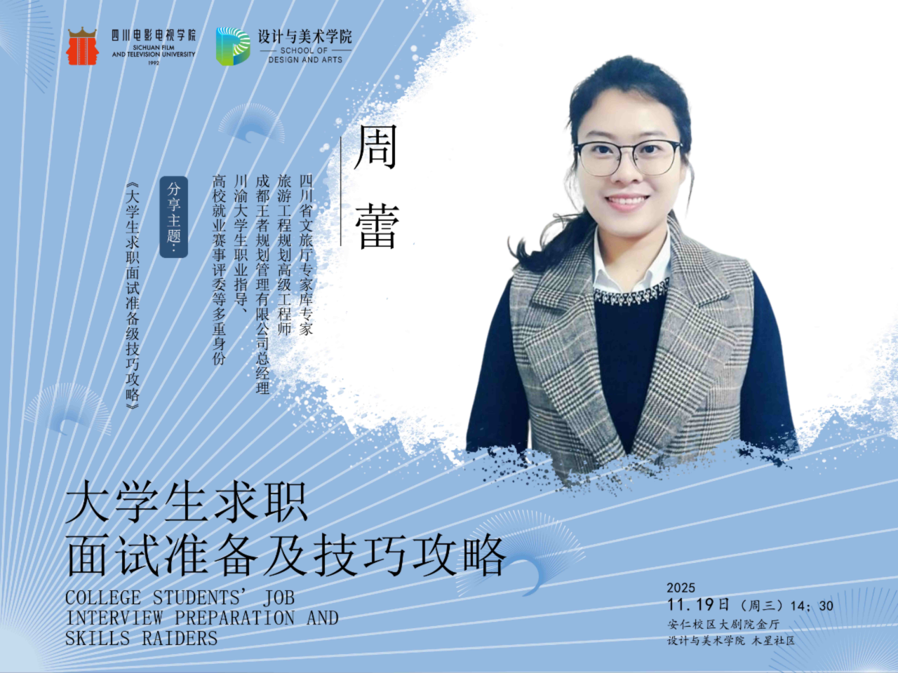 2025年11月19日下午,设计与美术学院与木星社区携手在安仁校区大剧院金厅开展了一场以“大学生求职面试准备及技巧攻略”为主题的讲座。拥有四川省文旅厅专家库专家、旅游工程规划高级工程师、成都王者规划管理有限公司总经理、川渝大学生职业指导、高校就业赛事评委等多重身份的主讲人周蕾老师分析的就业市场现状与讲述...
